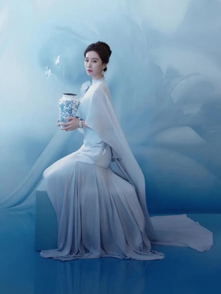 这套造型的高级感,藏在每一处极简匠心里。礼裙选用轻盈亲肤的薄纱,层叠工艺暗合春日意象,不张扬不堆砌,与她沉静气质浑然天成;搭配的高级珠宝与腕表点到即止,只添质感不抢风头,完美契合东方美学 “留白” 智慧。她手持花枝轻倚台案、端坐凝视,芭蕾功底赋予的挺拔体态,让优雅更具风骨,既有江南女子的柔婉,又有从容大气的气场,每一帧都堪称视觉盛宴。